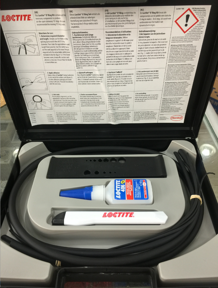 产品简介:乐泰O型圈维修盒是一个"0"型圈"仓库",可以利用其中的"0"型橡胶条,乐泰瞬干胶406和专用切割工具在现场一分钟之内制成和用的"0"型密封圈.既解决了燃眉之急,有可减少"0"型密封圈的贮存