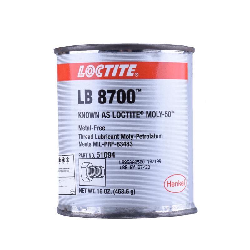 Loctite51094—银基抗咬合剂通用型抗咬合润滑剂,含有铜和石墨。该产品是用石墨和金属薄片增强的高性能,重载,抗高温,以石油为基底的润滑剂混合物。产品为惰性,不会在极冷或极热的情况下变硬或者蒸发。耐温-29度至+398度。防止金属部件在高温等极端环境中发生的锈蚀,腐蚀,磨损或者咬合现象。防止金属侵蚀、擦伤或者凹陷、高温低转速轴承润滑。耐用的工业润滑剂,可以在398度摄氏度高温环境下保护工件。消除螺纹结合部擦伤,包括铝和不锈钢。润滑螺丝、齿轮、链条、电镗、链齿轮、杠杆、滚筒卷轴、输送机械、高温炉门和铰链。